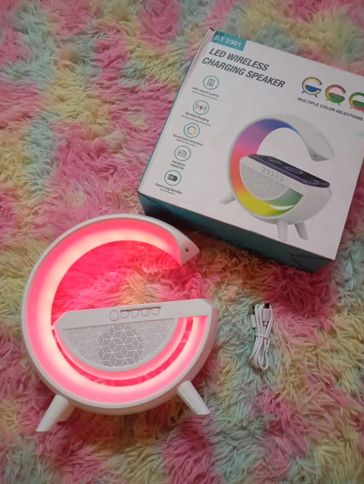 Su diseño moderno en color blanco combina con cualquier espacio —ya sea tu dormitorio, escritorio o sala—, y su cargador inalámbrico integrado te permite mantener tu celular siempre con batería, sin cables ni complicaciones.